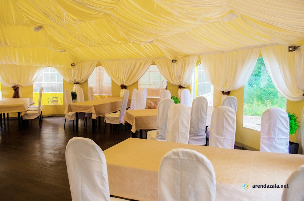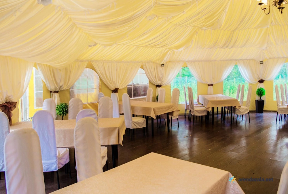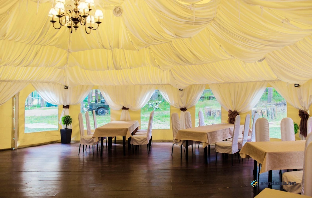 Банкетный шатер располагается в живописном месте, окруженном сосновым лесом и наполненном свежим воздухом. Уютная атмосфера и светлый интерьер создают идеальные условия для проведения семейных праздников и корпоративных мероприятий. Шеф-повара предлагают вкусные блюда, хоть и простые, но разнообразные. Помимо банкетного зала, здесь есть зона с бассейном и лежаками, а также веревочный парк для активного отдыха на свежем воздухе, что делает это место идеальным для проведения выходных в кругу семьи или друзей.